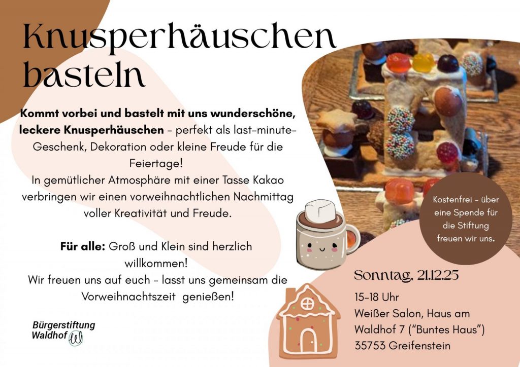 Am 28.11. gibt es ein Adventskranzbinden, am 21.12. ein Knusperhäuschen-Basteln – jeweils im „Bunten Haus“ (= ehem. „Heilig Haus“/“Haus der Stille“ Komplex, Waldhof 12).