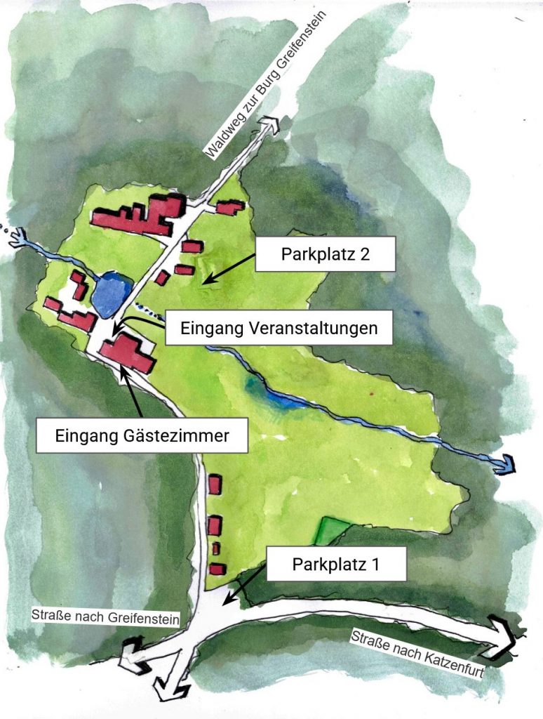 Mit den Öffis: Der nächste Zugbahnhof ist Katzenfurt, der circa 5 km von uns entfernt ist. Von Katzenfurt fahren auch Busse nach „Waldhof Greifenstein“ (Linie 205; circa 50 m vom Waldhof entfernt) und „Ehringshausen-Greifenthal Forsthaus“ (Linie 204; circa 2 km vom Waldhof entfernt).
