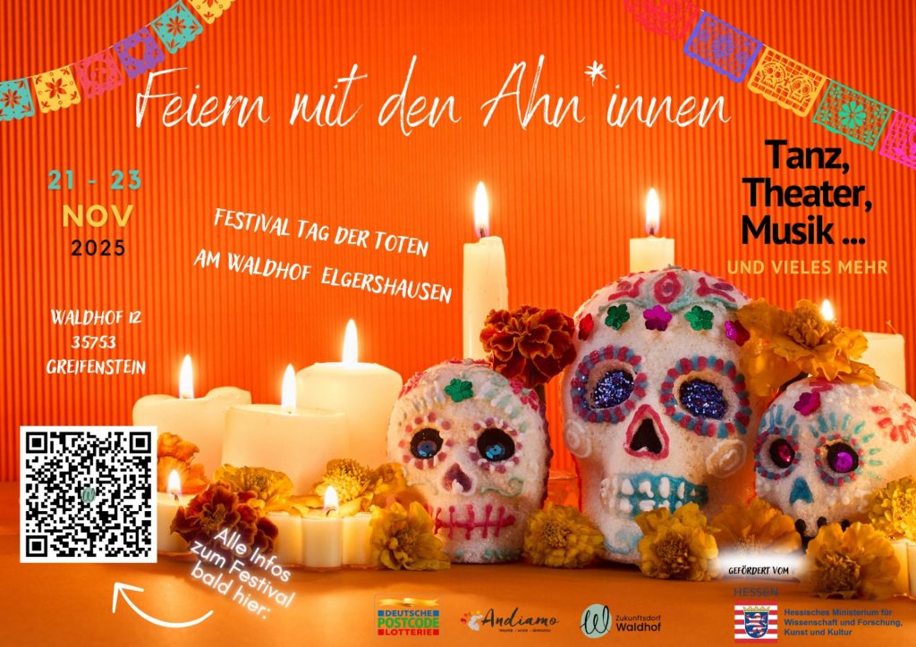 Inspiriert von der mexikanischen Tradition des Día de los Muertos feiern wir am Waldhof zum dritten Mal ein interkulturelles Kulturfestival der Erinnerungen: mit Musik, Theater, Literatur und einer großen Ofrenda ehren wir unsere Ahn:innen und feiern das Leben selbst.