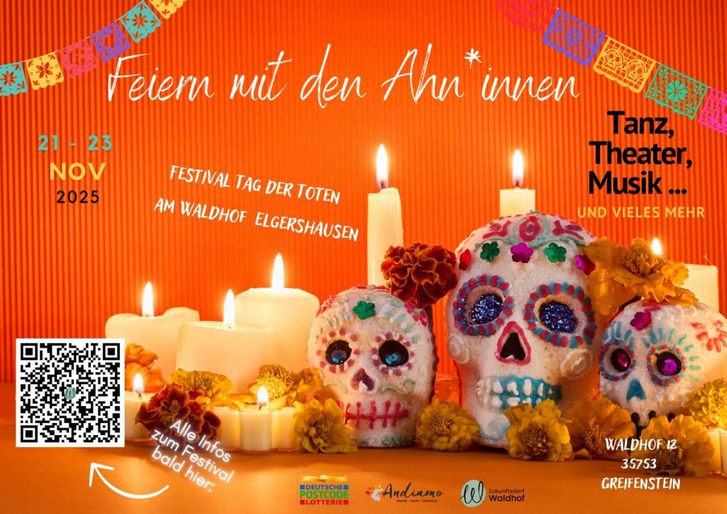 Vom 21. bis 23. November 2025 findet am Waldhof wieder das beliebte mexikanische Fest zum Tag der Toten statt. Es erwarten Euch Musik, Tanz, Aufführungen und vieles mehr. Das Motto ist dieses Mal: „Feiern mit den Ahn*innen“.