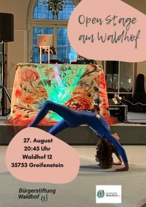 Zum feierlichen Abschluss des Workcamps und als große Einladung an alle in der Region gibt es am Mittwoch, den 27. August abends ab 20:45 (Einlass ab 20:30 Uhr) einen bunten „Open Stage“ Abend! Sowohl unsere internationalen Gäste als auch alle aus der Region, die Lust haben, können kreative Beiträge auf die Bühne im Festsaal am Waldhof bringen. Alles ist möglich – Musik, Gesang, Lesung, Theater, Witze, Spiele, Oberflächliches, Tiefgehendes, u.a…. Soundanlage ist vorhanden. Einlass frei, Getränke stehen zum Verkauf. Und vielleicht gibt es auch kulinarische Spezialitäten aus den Herkunftsländern unserer Gäste zum Verkosten…
