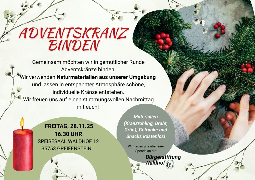 Materialien (Kranzrohling, Grün, Wickeldraht) sowie eine kleine Verköstigung sind kostenfrei – wir rechnen mit 20-30 Personen.